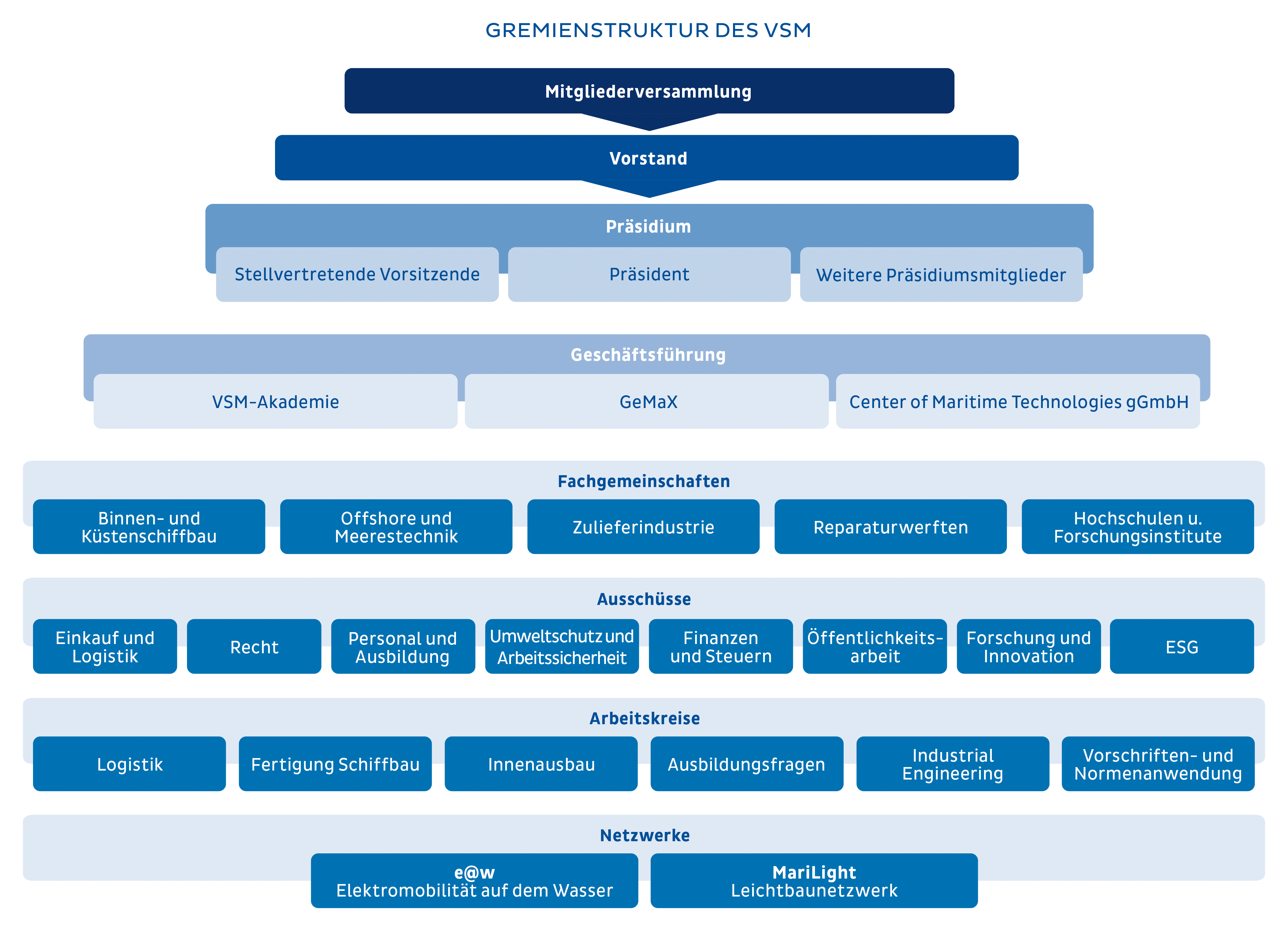 Der VSM vertritt direkt und indirekt über 800 Unternehmen und Organisationen: von spezialisierten Hochschulen, Forschungseinrichtungen und Dienstleistern über Hersteller von Materialien, Komponenten und Systemen bis hin zu den Werften als Systemintegratoren.